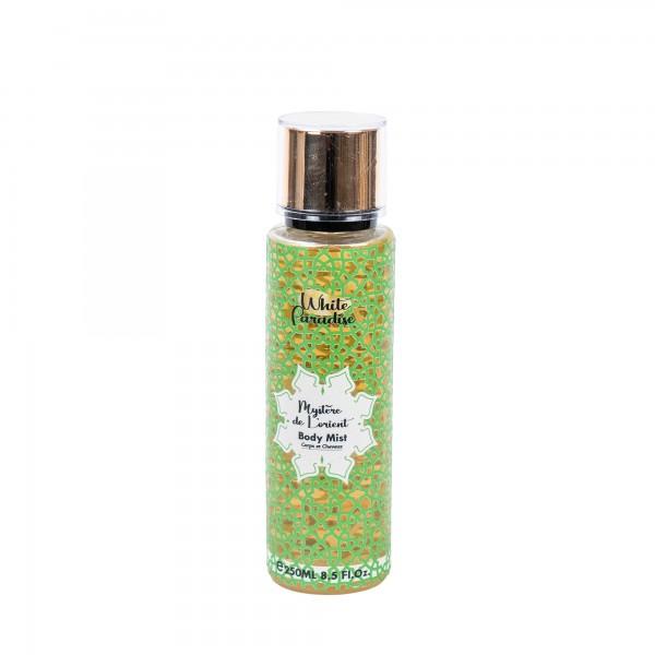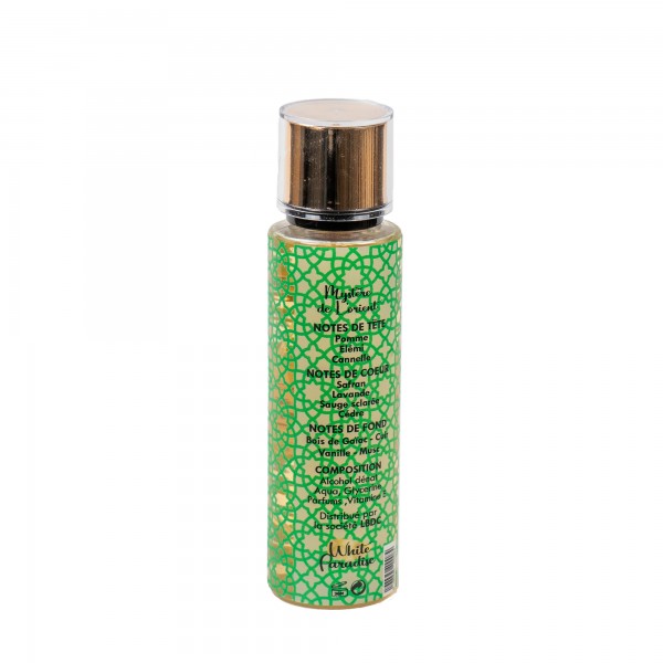 Brume Mystère d’Orient par White Paradise Plongez dans l’intensité et la chaleur des senteurs orientales avec cette brume envoûtante. Elle s’ouvre sur la fraîcheur fruitée de la pomme, relevée d’épices subtiles, avant de révéler un cœur raffiné mêlant safran, lavande et cèdre. Son sillage profond associe le cuir, la vanille et le musc à la richesse boisée du gaïac, pour une signature olfactive mystérieuse et captivante.